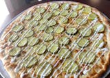 White. Mozzarella cheese, pickles, creamy garlic sauce, topped with dill spices, and a ranch drizzle.